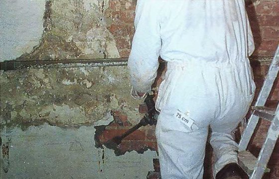 Altputz vollständig, minestens aber 80 cm über dem oberen Zerstörungs-/Feuchtigkeitsrand entfernen. Schadhafte Fugen 2 cm tief auskratzen.