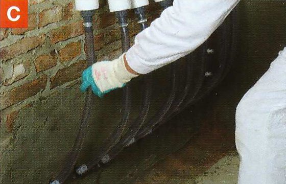 Um die Wände gegen aufsteigende Feuchtigkeit abdichten, wird über ein Niederdruck-Injektionsverfahren eine Horizontalsperre mit Verkieselungsmaterial in die betroffene Wand eingebracht. Die dabei eingesetzte Kieselsäure verengt das Kapillarengefüge des Mauerwerks und verhindert dadurch nachhaltig ein weiteres Aufsteigen der Feuchtigkeit.